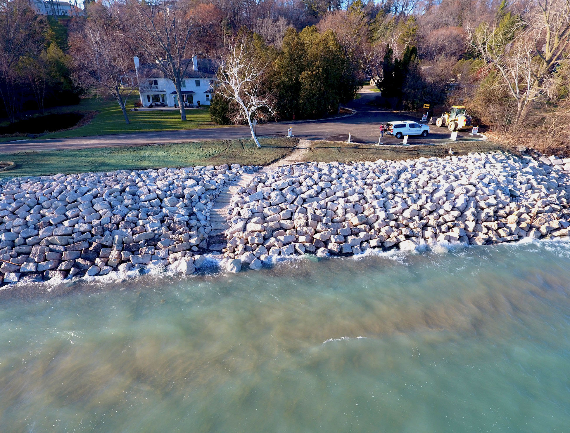 MSA provided construction administration for the final phase of the project and helped to coordinate revetment work with private property owners along the north shore. Over 35,000 tons of revetment stone totaling over 1,500 truckloads has been delivered and placed along 2,500 feet of shoreline. The stormwater conveyance system has been improved to include green infrastructure such as bioretention ponds which treat water and remove contaminants before entering Lake Michigan. New access points to the water have also been added, which allow the public to safely and consistently enjoy the waters of Lake Michigan. All of this has been completed while preserving mature trees, upholding lakefront aesthetics, and maintaining views of the lake for homes along the shoreline and lower bluffs. The result is a vastly improved and fortified shoreline that will protect residential homes, shield Village utility networks, and encourage lakefront recreation for decades to come.
