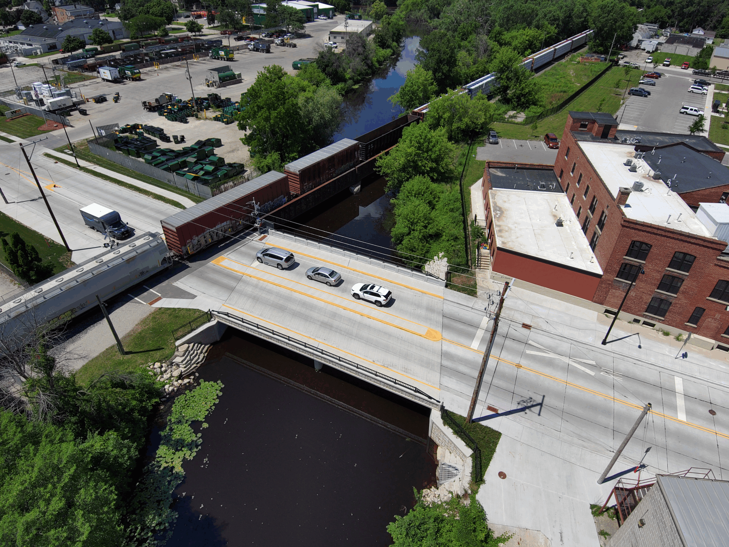 Adjacent to a tight urban corridor and a busy Canadian National Railway crossing, the project required close coordination with the City of Fond du Lac, Wisconsin Department of Transportation (WisDOT) Northeast Region, Canadian National Railway, and public and private utility departments. It involved bridge construction within its constrained urban environment, designated “quiet zone” accommodations, retention and fortification of the former west abutment structure of the bridge to support train traffic during construction, and the use of vibration-monitoring equipment to ensure that construction operations would not adversely impact the adjacent historic Winnebago Cheese factory property undergoing a simultaneous renewal development.